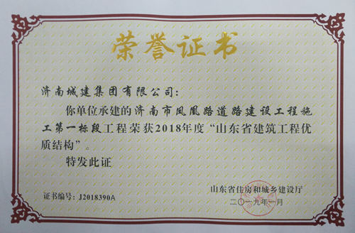 濟南市鳳凰路道路建設工程施工第一標段工被評為2018年度“山東省建筑工程優(yōu)質結構”