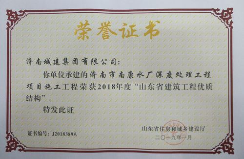 濟(jì)南市南康水廠深度處理工程項(xiàng)目施工工程被評(píng)為2018年度“山東省建筑工程優(yōu)質(zhì)結(jié)構(gòu)”