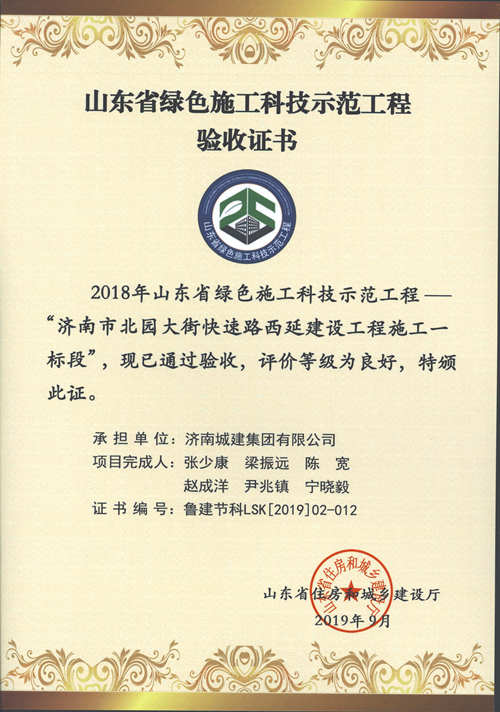 濟(jì)南市北園大街快速路西延建設(shè)工程施工一標(biāo)段被評為2018年山東省綠色施工科技示范工程