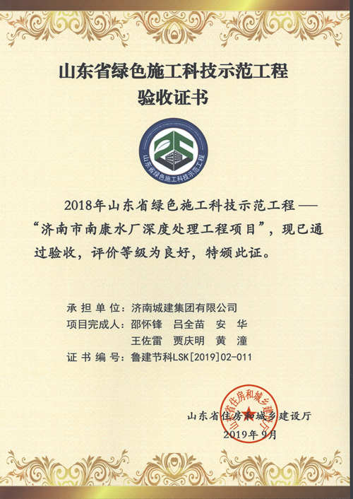 濟(jì)南市南康水廠(chǎng)深度處理工程項(xiàng)目被評(píng)為2018年山東省綠色施工科技示范工程